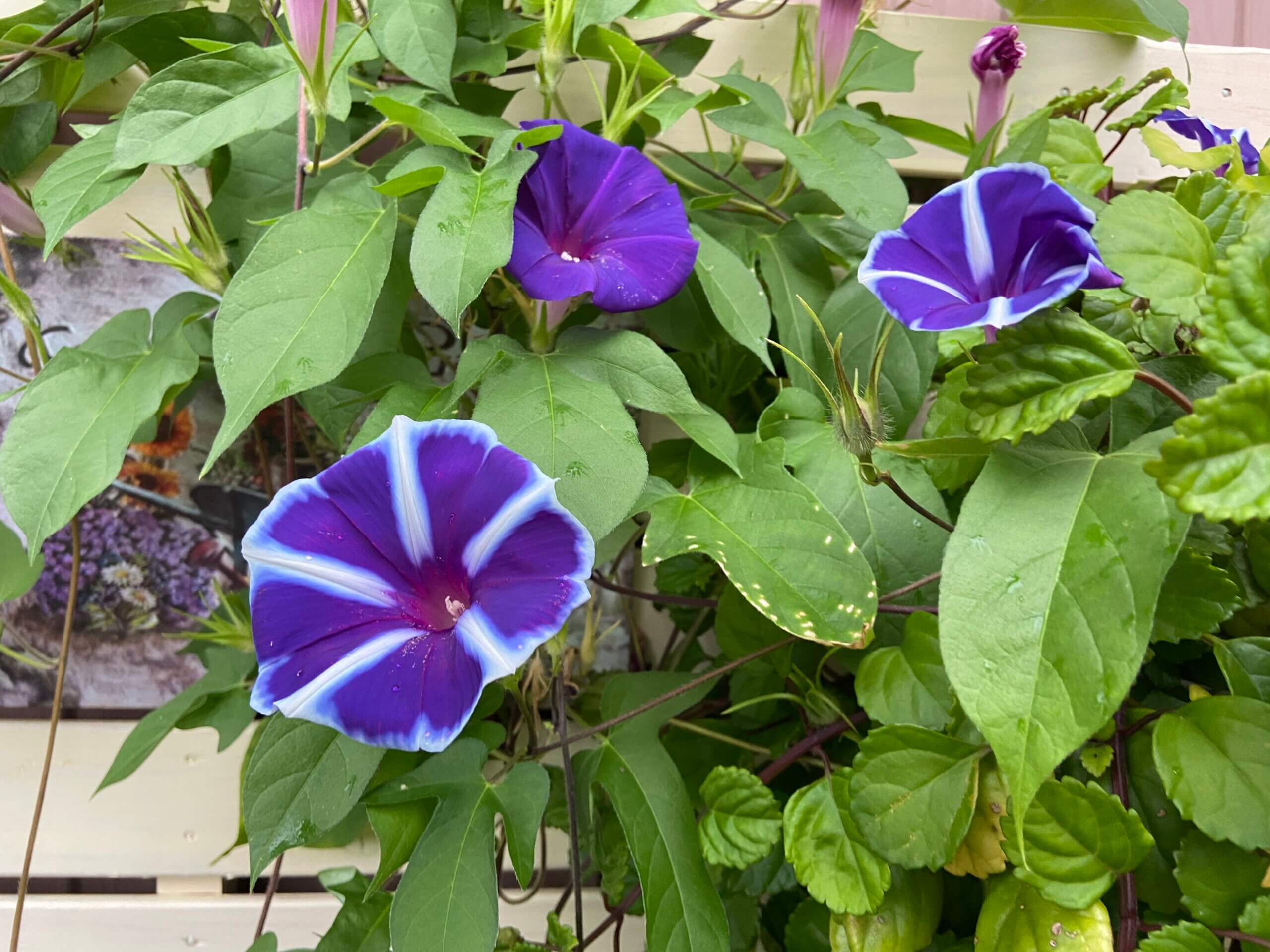 おはようございます😊 青い空に映える モミジアオイ あさがお カリブラコア 切り戻しをすれば ちゃんと咲いてくれます